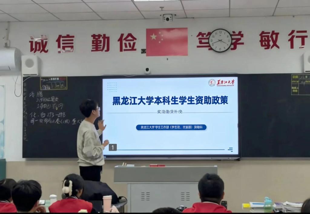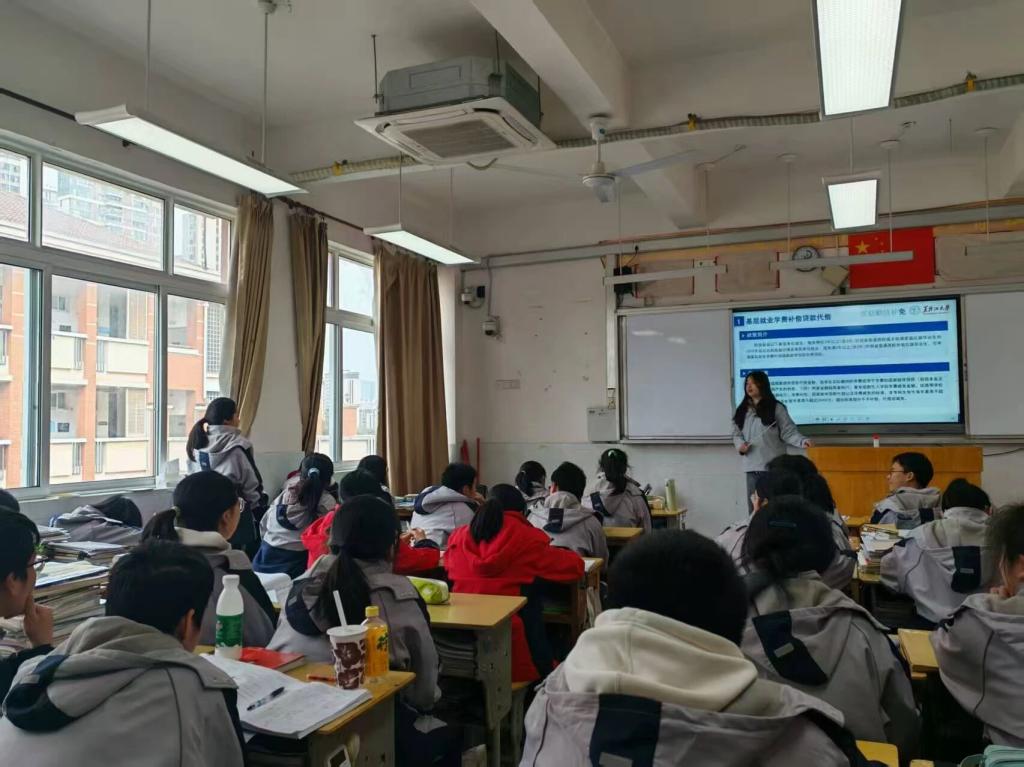 1月26日,杨明茜回到高中母校赣州中学开展本科生资助政策宣传教育活动。活动前,她认真梳理生源地信用助学贷款、国家奖助学金、绿色通道、学费减免、勤工助学、临时困难补助及学费补偿代偿等资助内容,结合高三学生需求准备宣讲材料并与母校沟通对接;宣讲现场,她采用线下讲解与互动答疑相结合的形式,围绕入学前、入学时、入学后全流程资助体系细致解读,结合自身经历与真实案例耐心解答学生疑问。此次返校宣讲活动有效普及了国家及高校资助政策,消除了学子升学顾虑,坚定了备考信心,也展现了黑大学子回馈母校、服务社会的青春担当。