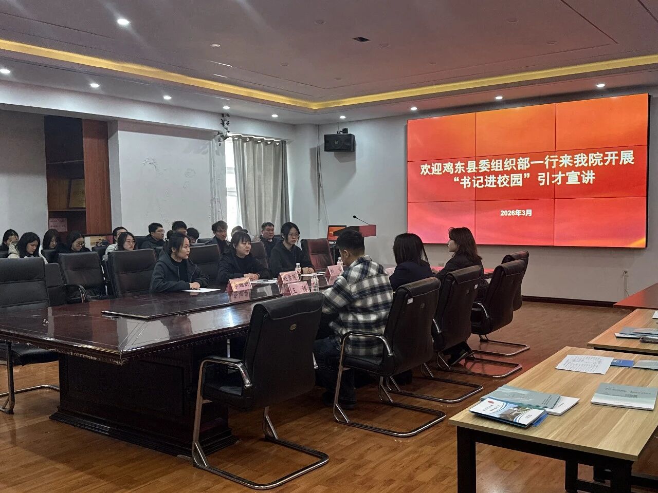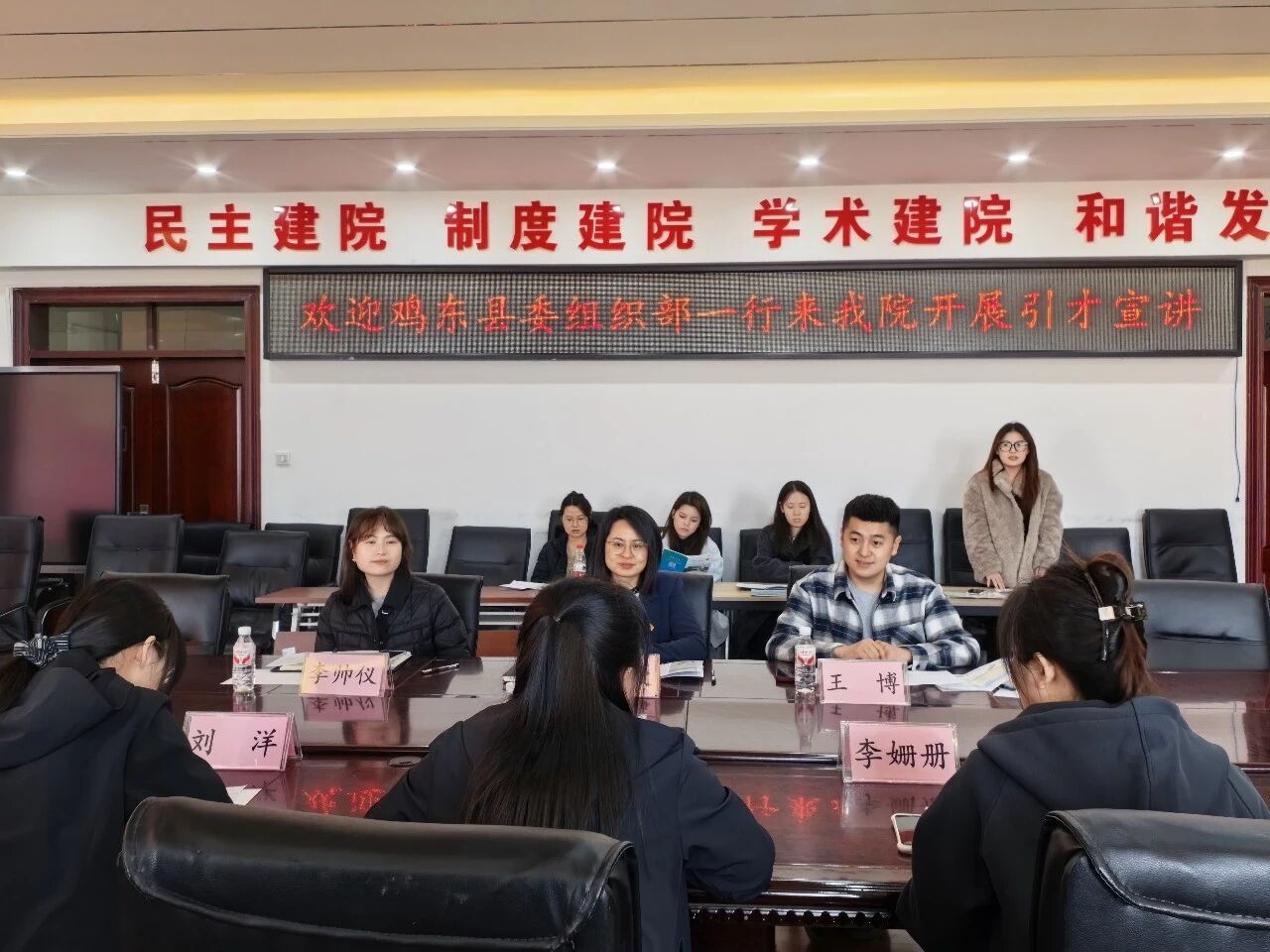 解读“市委书记进校园”引才活动,特别是招聘法学毕业生的具体岗位,还重点介绍了我院2026届毕业生的当前就业情况。我院师生观看了鸡东县城市宣传片和人才公寓建设、假期实习实践宣传片,鸡东县人才工作中心主任赵雪莲,鸡东县委组织部人才组组长刘洋、组员李姗姗详细介绍了本次招聘的岗位设置、人才补贴政策、考试流程等,并面对面与学生们进行答疑互动,向广大学生发出诚挚邀请。